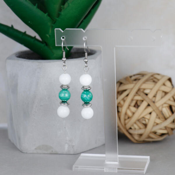 Malachit és tejkvarc 8mm-es ásványból készült fülbevaló, tárcsa köztessel.