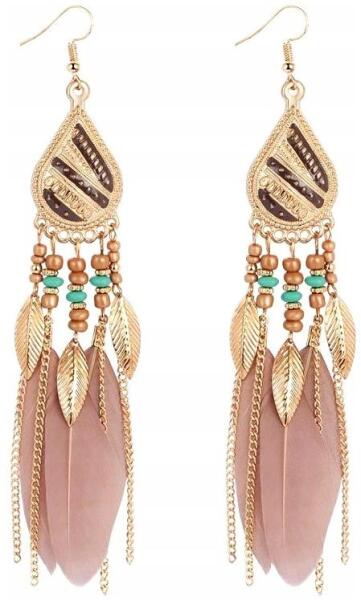 Fülbevaló hosszú lógós tollas boho orientális rózsaszín női tollakkal (B61)ALLEGRO