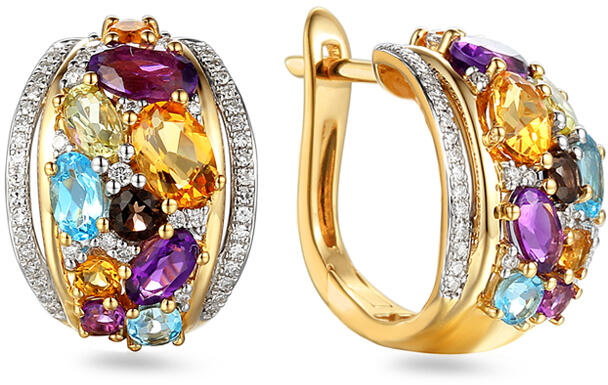Száz csillogó gyémánt, össztömeg 0,410 ct, H szín és tisztaság SI1, ametiszt, citrin, topáz, citromkvarc és füstkvarcit kövek kombinációjával díszítve össztömeg 4,010 ct. Hangsúlyozza szépségét ezzel a varázslatos arany fülbevalóval.