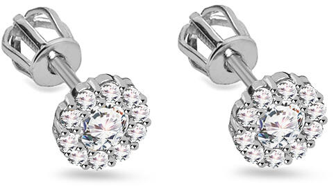 A csillogó cirkóniával teli bájos fülbevalók feldobják megjelenését. A cirkóniák tiszta színűek, fazettált csiszolással vannak megmunkálva, és fehérarany ágyban vannak elhelyezve „pavé stílusban. A rögzítéshez csavaros zárat használnak, így a viselés során a biztonság elsőbbséget élvez, mint maga a dizájn.