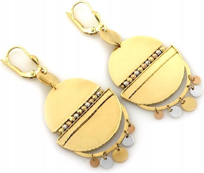 Hosszú, arany színű, 585-ös függő fülbevaló, modern körökkel, 14 karátos, mozgó medálokkalALLEGRO