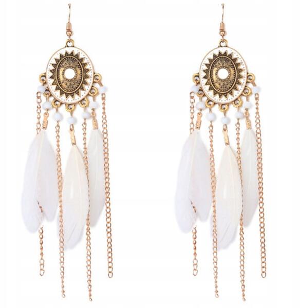 Modeus Fülbevaló fehér arany lógó hosszú boho tollak (GB-9)ALLEGRO