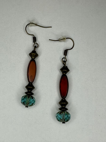 A mély bordó és áttetsző türkiz gyöngyök játékosan kontrasztosak – a bronzos kiegészítők pedig meleg, vintage hangulatot adnak a darabnak.